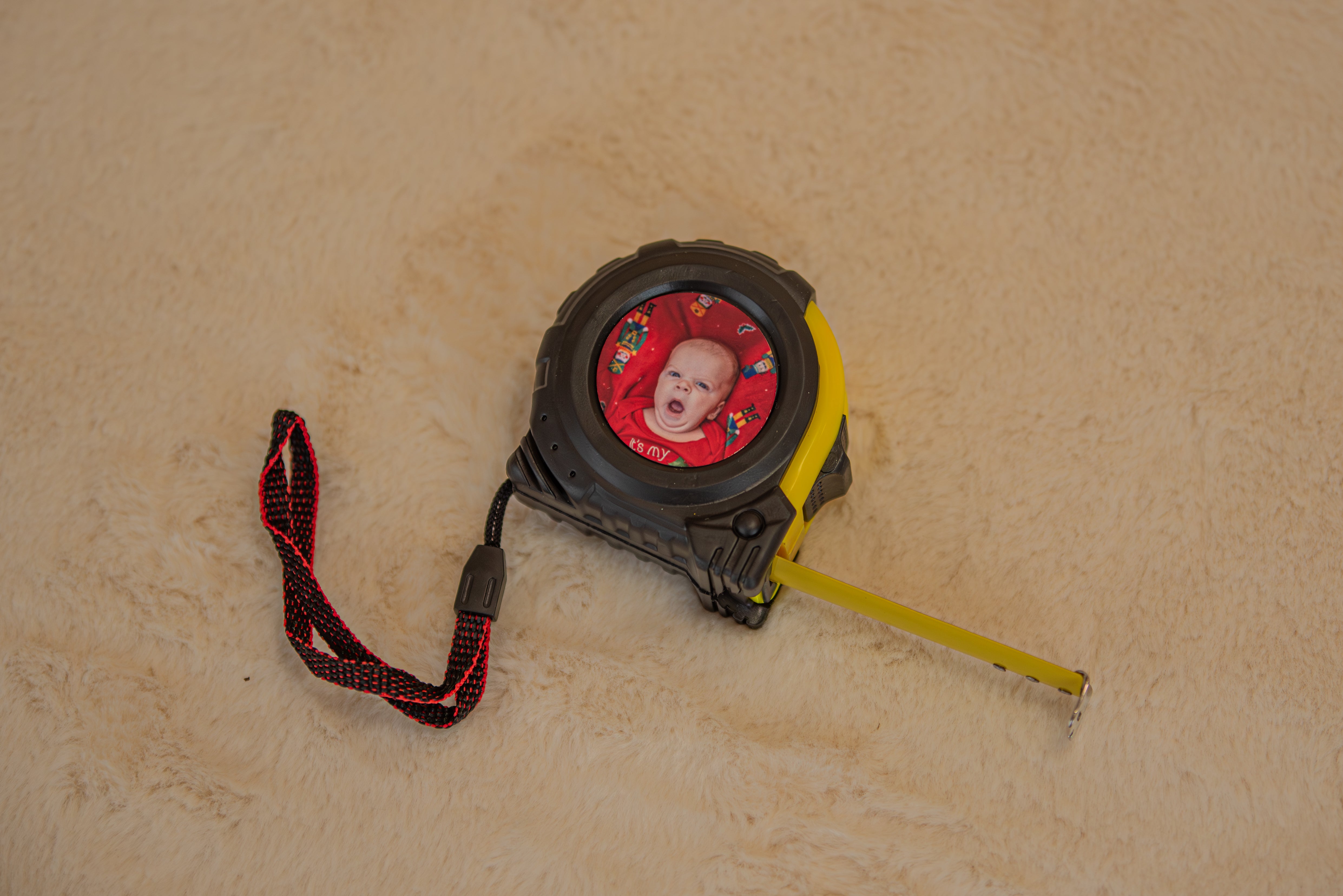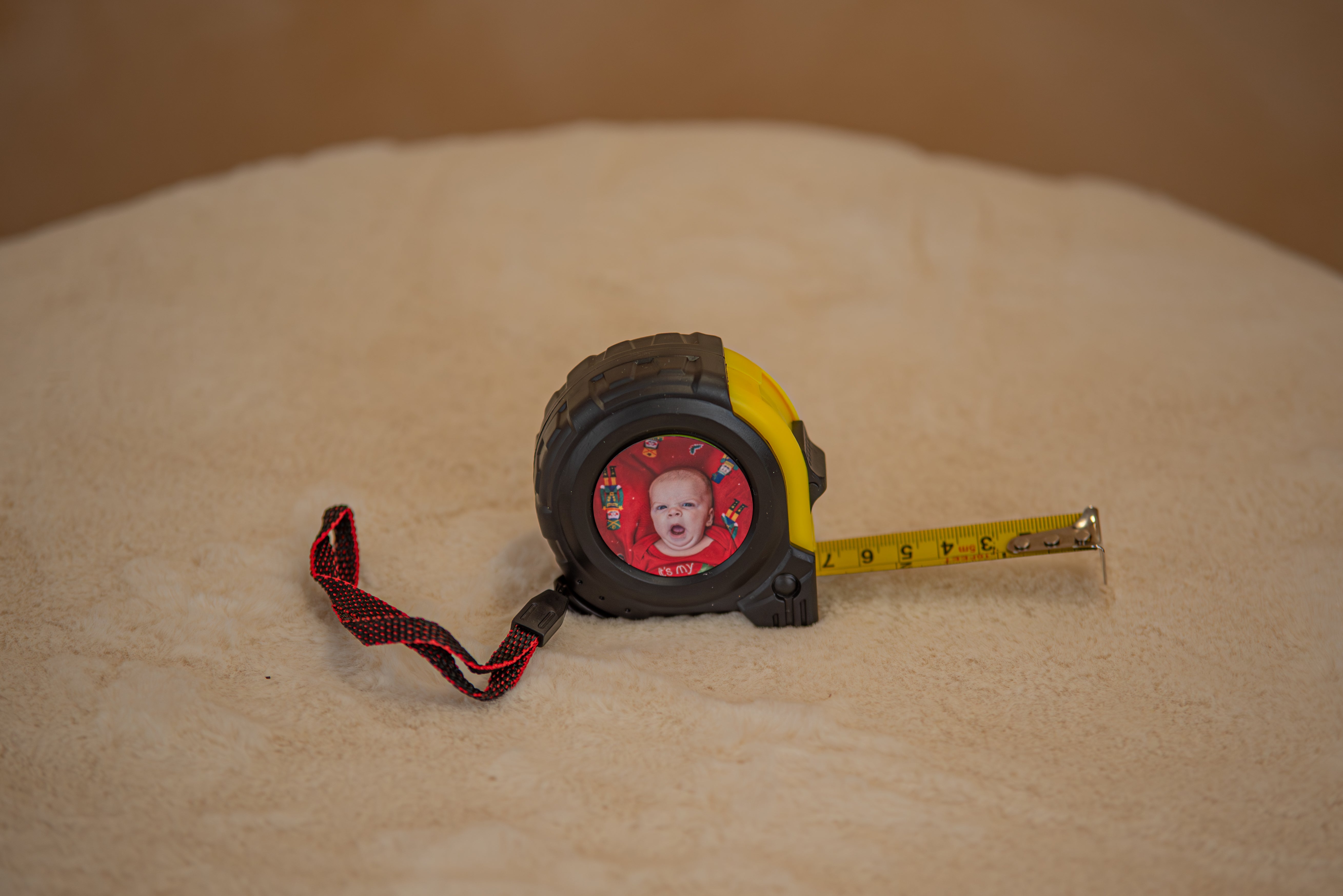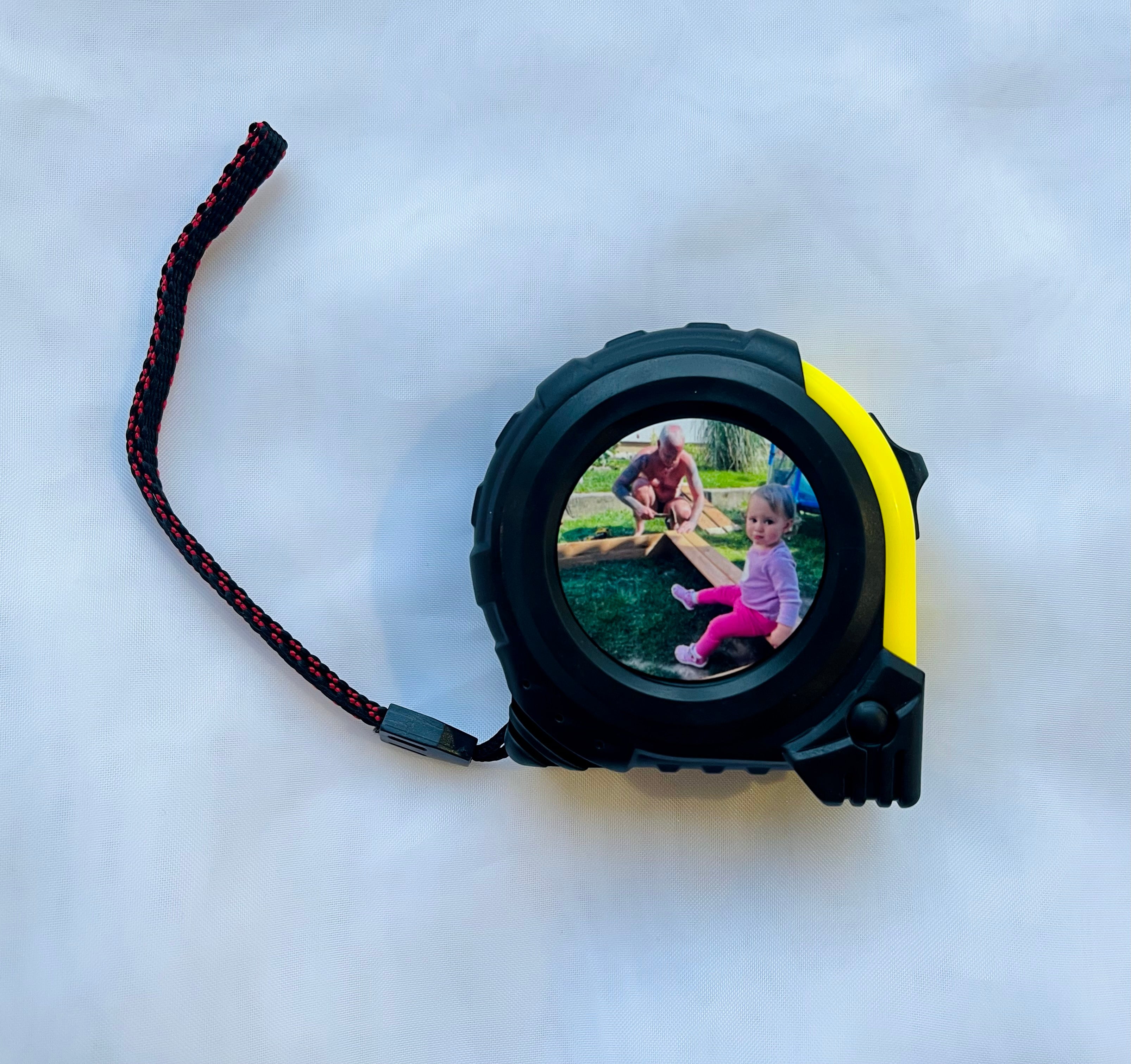 Fényképes mérőszalag, fém 5 méterig kihúzható szalag, strapabíró házban fékkel és csipesszel ellátva.